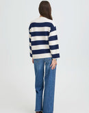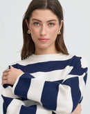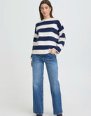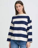 The Otari sweater is the perfect transition piece into spring. Classic navy and soft white stripe. Crew neck with a boxy body and straight sleeve.