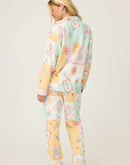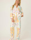 Sleep, lounge, repeat in this dreamy three-piece flannel set with a whimsical, luck-inspired twist. Made from soft cotton in a classic twill weave, it includes a button-up shirt, relaxed-fit pants, and a matching headband. The patchwork-style design blends soft ivory, pastel mint, peach, and lilac, scattered with playful motifs—lucky playing cards, eye talismans, radiant hearts, blooming flowers, and “Lucky Me” script—for a look that’s as charming as it is cozy.