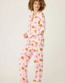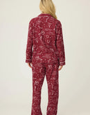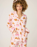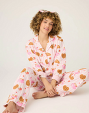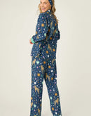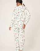 Women’s 3-piece pajama set in natural card-game print. Includes button-up shirt, relaxed-fit pants, and printed headband. Made from 100% cotton twill.