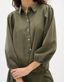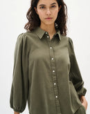 It has a slightly loose fit, gathered shoulders and cuffed elasticated sleeves. It comes in a soft khaki green colour that is easy to match.