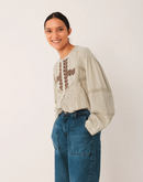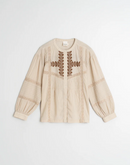 Slightly dropped shoulder and balloon sleeve with cuff and button closure • Button-front closure • Embroidery with ethnic motif, lace inset and pleats on waist and sleeves • Organic cotton gauze fabric • Regular fit: Designed for a standard fit • Measurements on size S flat: Length from shoulder: 63cm. Chest width: 52cm. Bottom width: 60cm. • Sizing: +1 cm in length per size and +2 cm in contours.