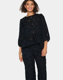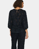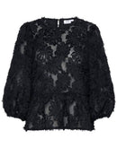 This black blouse features a beautiful embroidered floral design with a partially sheer background, creating a sophisticated and elegant look. The blouse has balloon sleeves, a relaxed fit, and a button closure at the back.