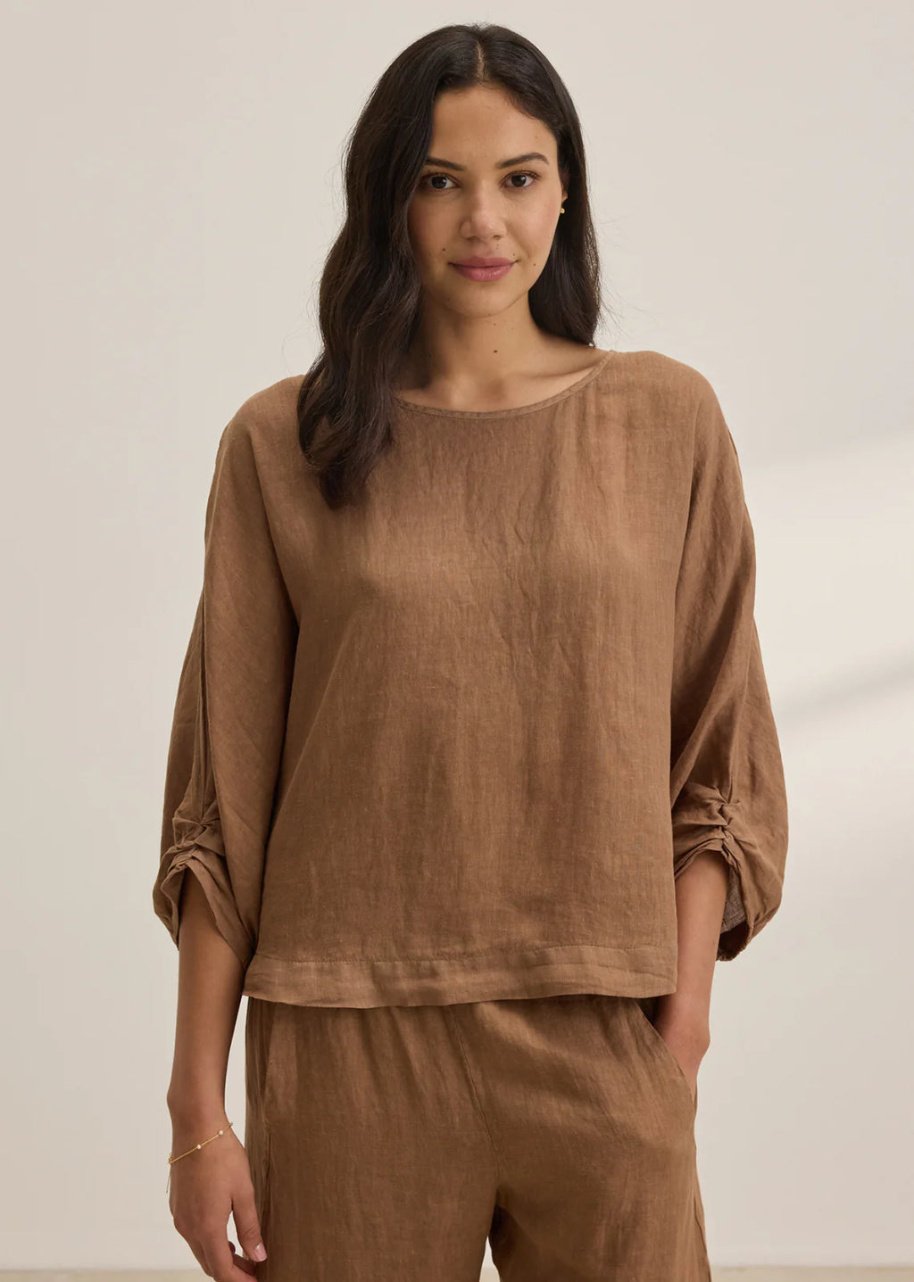 Crafted from woven linen for a breezy feel, this round-neck top features a single-button closure at the back. The twist knot detail on the 3/4-length sleeves adds a distinctive touch, while the cocoon silhouette ensures comfort...