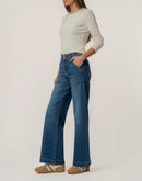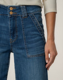 - Structured meets effortless in these high rise, straight leg jeans, designed in a classic medium wash with a modern edge. Porkchop pockets and a double button closure add utility-inspired detail, while the stretchy material keeps the fit flexible and flattering from day to night.