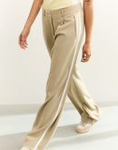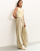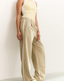These elegant trousers are made from a soft woven fabric and feature a loose wide-leg fit. The high waist with pleat details adds a refined touch, while the stripe detail along the side creates a subtle, modern accent. Designed with side pockets and welt pockets at the back. Perfect for a stylish, effortless look.
