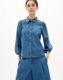 Denim shirt in a washed blue tone with a classic collar, front button closure, and wide cuffs. Features voluminous sleeves and subtle gathering at the shoulders for a soft silhouette. Crafted from structured cotton denim with a soft feel.