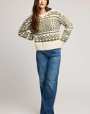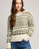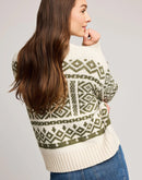 The Cypress sweater is made of a soft yarn with a jacquard knit pattern. Features include a crew neckline and wide ribbed sleeve cuff and hem band.