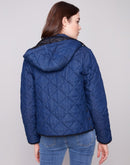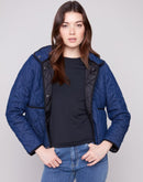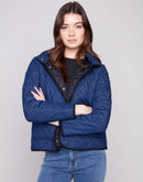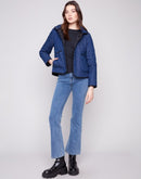 Denim Quilted Puffer Jacket With Removable Hood And Snap Buttons