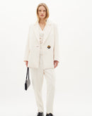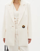 White boxy blazer with classic lapels and a single-button closure. The blazer features two front pockets and a loose, modern fit. Additionally, the blazer has a diagonal vent at the back. The model is 176 cm tall and wears size 36/S.Fit