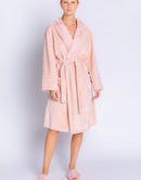 Stop and smell the cozy roses. Scattered blooms in soft pink add a vintage-inspired finish to this ultra-soft fleece robe, crafted for serious snuggle weather with a plush, nubby texture that feels like a hug. The relaxed wrap silhouette features roomy sleeves, pockets, and a self-tie belt for a sweet, easy fit.