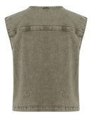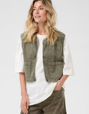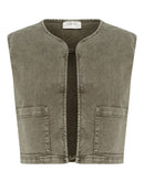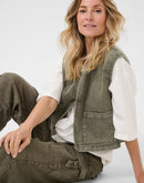 This women's denim vest offers a regular fit with a modern, open front design. Featuring structured shoulders, large patch pockets, and a round neckline, it ensures versatile layering for casual and smart-casual outfits.