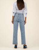 - These jeans are the perfect blend of comfort and classic style. Featuring a high rise and straight leg cut, they offer a flattering fit that’s both chic and comfortable. Crafted in a timeless vintage wash, these jeans boast a worn-in, effortlessly cool look that pairs seamlessly with any wardrobe.