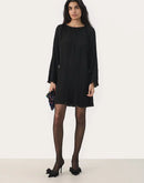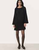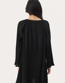 This black dress embodies simple elegance. The pleated texture adds a modern touch, while the wide sleeves provide a sophisticated look. With its light shape and soft drape, the dress is perfect for both formal events and festive occasions.