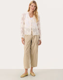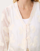 This romantic blouse is made from a light and airy fabric with delicate embroidered details. It features long sleeves, a feminine ruffled trim, and front tie closures for a delicate look. Perfect for both everyday wear and special occasions.