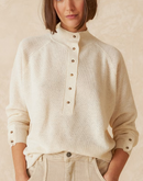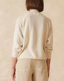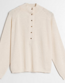 This Perkins-style sweater is made from a blend of wool and marine-origin thread. It features long sleeves with raglan cut and ribbed finishes at the collar, cuffs, and hem. The fit is straight, and it can be worn with a shirt underneath or directly against the skin