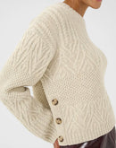 This warm knit stands out with its beautiful texture and decorative side buttons. The heavy knit quality and varying patterns add a handmade feel. Pair it with everyday jeans or a leather skirt for a modern twist.