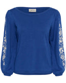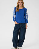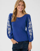 This women's blouse features a relaxed fit with elegant long balloon sleeves and delicate embroidery details. The round neckline enhances its versatile style, offering everyday comfort for effortless styling.