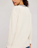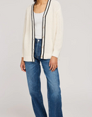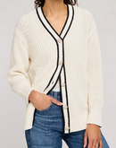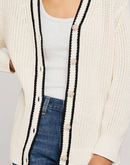 The Viola cardigan is made of a cotton blend yarn in a half cardigan stitch. Features include a front button closure with a contrast stripe detail.