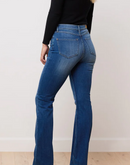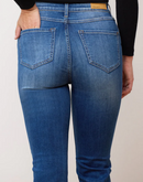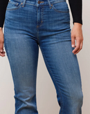 These classic rise jeans are a mid-blue wash, featuring light fading at the thighs, gently worn-in whiskers, and golden brown stitching, creating the look of authentic, timeless denim. The longer inseam is perfect for styling with a pair of heels or booties and can also be ideal for taller women who prefer a little extra length.