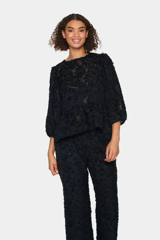 This black blouse features a beautiful embroidered floral design with a partially sheer background, creating a sophisticated and elegant look. The blouse has balloon sleeves, a relaxed fit, and a button closure at the back.