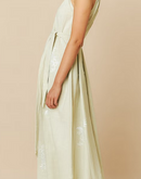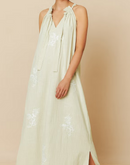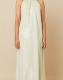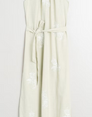 Halter dress with relaxed fit and adjustable waist with removable belt, allowing for multiple silhouettes in a single garment. This also features contrasting floral embroidery.