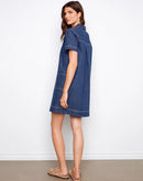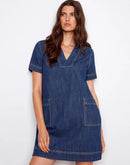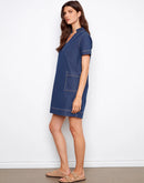 Indigo Relaxed Denim Dress A timeless collared V-neck denim mini dress crafted from a soft cotton-blend fabric. Features short sleeves, a relaxed fit, and functional patch pockets at the waist for everyday practicality. The versatile indigo wash pairs effortlessly with sneakers, sandals, or boots. Fabric: 90% Cotton, 9% Polyester, 1% Spandex Care: Machine wash delicate in cold water. Do not bleach. Hang to dry. Iron on low setting if needed. Dry clean optional.