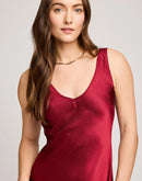 The Astra dress is made of a bias cut textured satin fabric. The classic slip dress silhouette features a front and back v-neckline.
