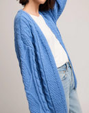 The Betty cardigan is made of a fuzzy yarn with a lofty feel. Features include various cable knit stitch patterns and a rolled sleeve hem detail.
