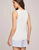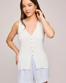 The Miles tank is made of a soft yarn in a rib knit pattern. Features include a v-neckline and functional button closure.
