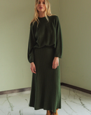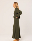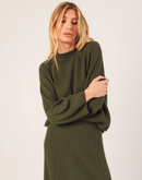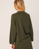 Boxy ribbed sweater with a Perkins collar and side slits. The sleeves are raglan style and slightly wide.