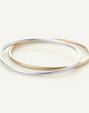 What lightweight stacking dreams are made of. Set of 2 or 5 high-shine bangles. This water-durable design brings major impact to your stacking game with zero weight. Dane is super easy to put on and remove. To open, gently pull apart the bangle at the seam, rotating the tubes in opposite directions. Close by rotating back to the seam, and inserting the smaller tube into the opening. As this stainless steel is a very durable material, it can withstand some water exposure. The perfect piece to wear if you don’t intend to take it off. The circumference measurement of the bangles are 6 1/2" and 7 3/8", so make sure to add a little extra space for comfort of movement. One bangle is finished in high-polish rhodium, and the other is finished in high-polish gold.