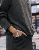 A removable heart is hooked onto crisp, faceted links with small carabiner clasps. The chain can be split in half and used as a small bag charm or keychain. Finished in high-polish silver.