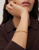 This gold bracelet opens and closes with a hinge and tab lock closure. To open, push down on the highest point of the clasp before pulling the bangle open. To close, listen for a "click" to ensure tab is locked properly. Note: this design wears best when the closure is secured on the inside of your wrist.