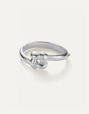 This silver bracelet opens and closes with a hinge and tab lock closure. To open, push down on the highest point of the clasp before pulling the bangle open. To close, listen for a "click" to ensure tab is locked properly. Note: this design wears best when the closure is secured on the inside of your wrist.