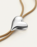 This bolo tie is accented with a voluminous silver heart pendant. To adjust the length of this necklace, simply draw the pendant along the cord in the desired direction. It features a beige cord made from recycled polyester and is finished in high-polish silver.