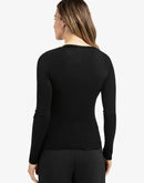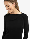 This feminine jersey top is designed with a pleated detail along the neckline, creating an elegant drape. Crafted from a soft and stretchy fabric, it features long sleeves and a straight fit. The subtle pleats add a refined twist to your everyday look.