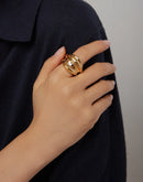 A dramatic statement ring boasting sculptural stretches and organically formed grooves. This gold ring is water-resistant, making it the perfect addition to your jewelry box. Finished in high-polish 14k gold.