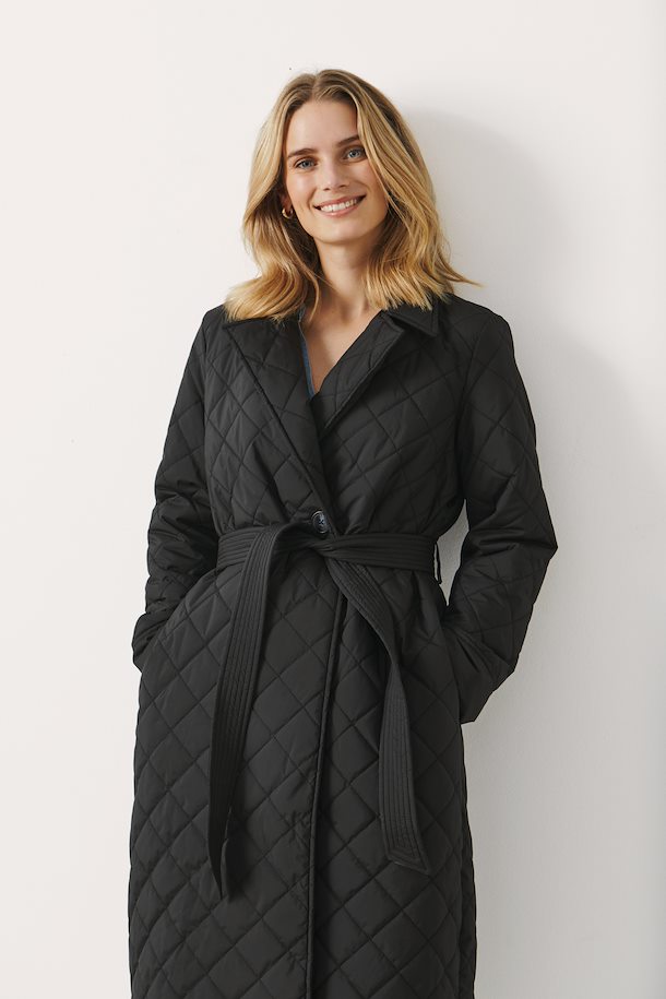 This long, lightly padded coat features a classic diamond quilted pattern and a high collar for extra protection against wind and cold. The sleek surface and gold-coloured zip add a modern touch. Ideal for transitional seasons ...