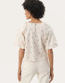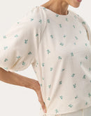 This light cream blouse with small green floral details is both feminine and versatile. Featuring short, loose sleeves and a textured fabric, it’s perfect for everyday wear. Pair with jeans or a skirt for a relaxed yet elegant look.