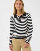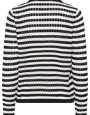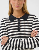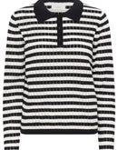 This navy and white striped knit is made from a light, breathable fabric with subtle openwork details. Featuring a collar and button placket, it offers a classic and timeless look.