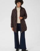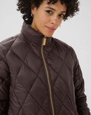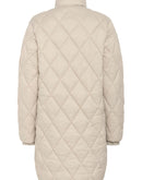 This long, lightly padded coat features a classic diamond quilted pattern and a high collar for extra protection against wind and cold. The sleek surface and gold-coloured zip add a modern touch. Ideal for transitional seasons and everyday wear.