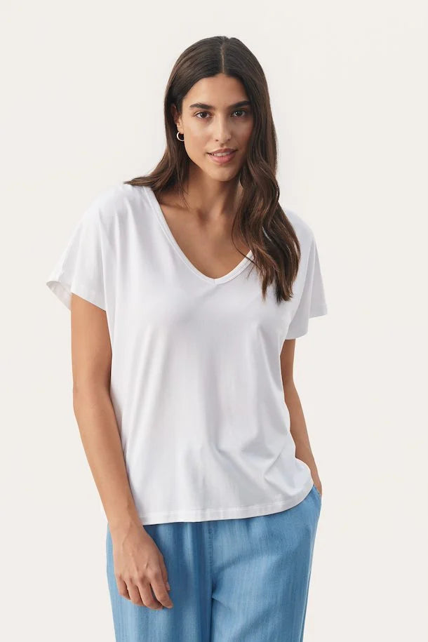 Part Two Axelines V-neck Tee. This stylish and lightweight tee features a beautiful flower print and is made with a comfortable linen blend, making it the perfect addition to your casual wardrobe.