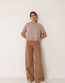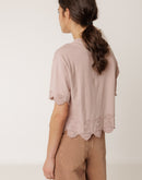 Crafted from pure cotton, this boxy tee features delicate scalloped edges along the sleeves and hem that add refined detail. The crew neckline is finished with an elegant tonal stitch, creating a polished, understated look. Perfect for layering or wearing solo, this versatile piece transitions effortlessly from casual to elevated styling.