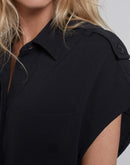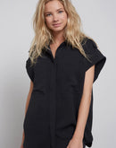 Elevate your wardrobe with our sleeveless shirt jacket. Featuring chest pockets, a blind placket, and button detailing, this shirt jacket combines sophistication and style. The flowy fit provides a flattering silhouette that is both comfortable and versatile.