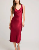 The Astra dress is made of a bias cut textured satin fabric. The classic slip dress silhouette features a front and back v-neckline.