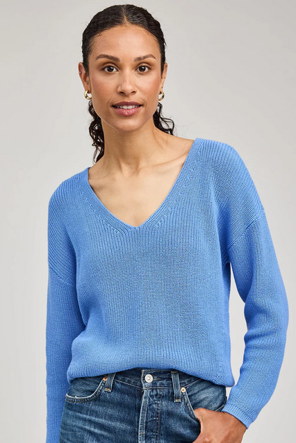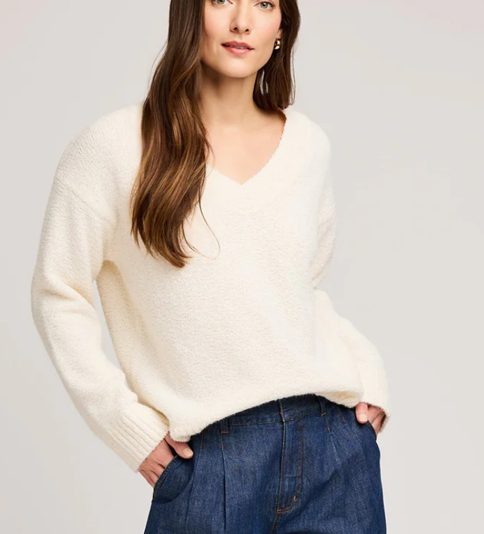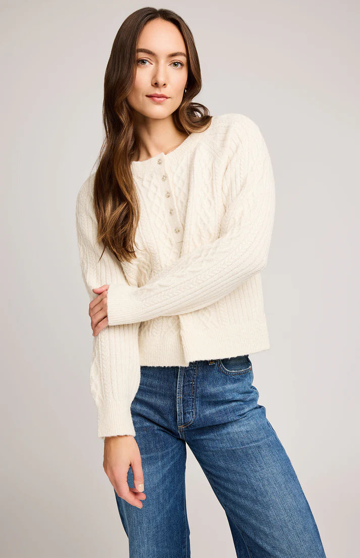 The Mia top is made of a soft yarn in a novelty stitch pattern. Features include a v-neckline and functional button front closure.